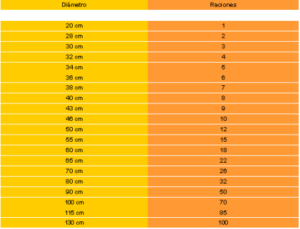 Se não tiver uma paellera, use uma frigideira grossa. Será rasa e aberta, como a panela ehola. Abaixo segue uma tabela que um amigo que trabalhou por alguns anos na Eha fazendo Paella me enviou, que relaciona o diâmetro da panela com o número de porções a serem servidas.